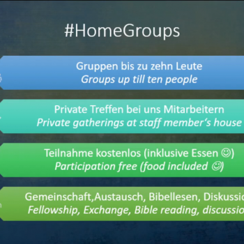 Neben unseren öffentlichen Veranstaltungen bieten wir auch private Treffen an, bei denen man sich in kleineren eher festen Gruppen trifft, um gemeinsam Bibel zu lesen, sich auszutauschen, zu beten und Gemeinschaft zu haben. Dafür gibt es die HomeGroups (Hauskreise).
